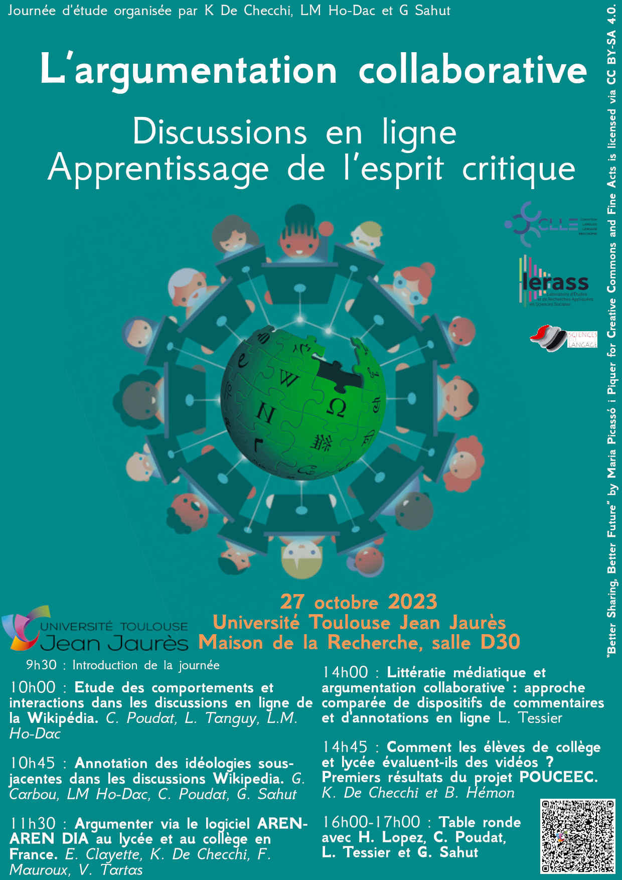 La journée sera également l’occasion d’inviter Céline Poudat, linguiste enseignant à l’Université Nice-Côte d’Azur et Laurent Tessier, sociologue enseignant à l’Université Catholique de Paris. Céline Poudat travaille en linguistique de corpus et a publié plusieurs ouvrages méthodologiques sur la linguistique outillée. Elle travaille notamment sur la caractérisation des interactions en ligne et notamment les discussions derrière l'encyclopédie Wikipedia, à la recherche d'indices pour détecter les désaccords et les interactions conflictuelles.